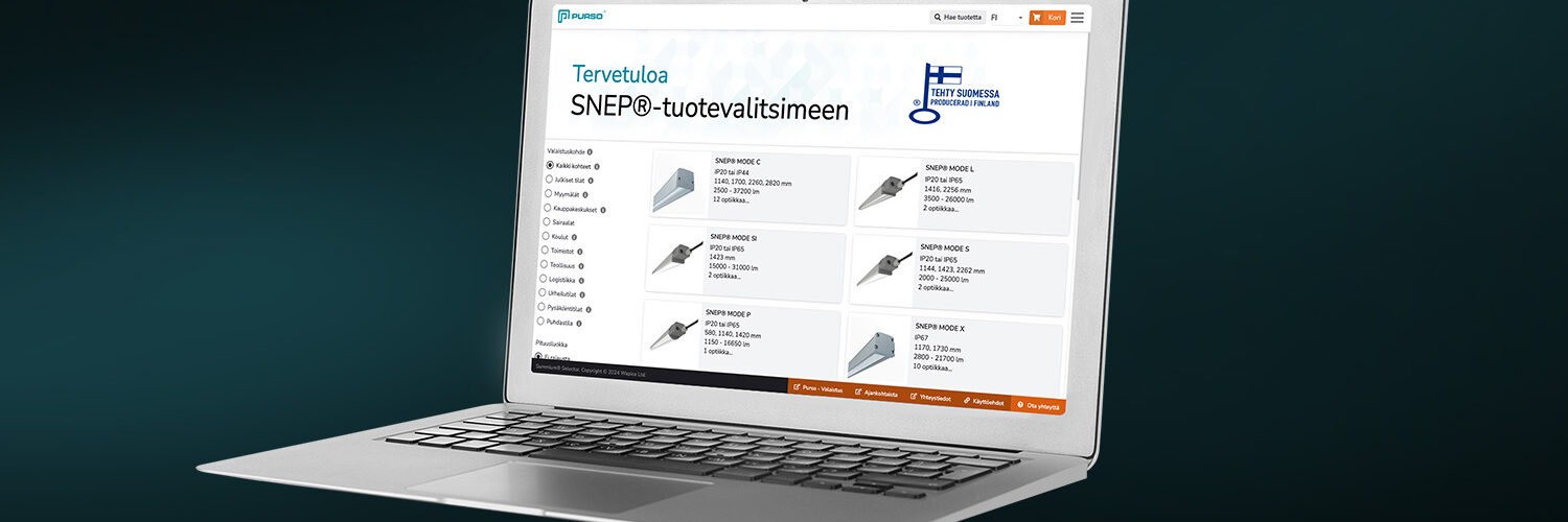 SNEP®-tuotevalitsimessa kaikki Purson valaisimia koskevat tuotetiedot ovat samassa paikassa, yhdellä istunnolla nähtävissä. Löydät työkalusta ajantasaiset tiedot asennusohjeista aina tuotekortteihin asti. Kun haluat siirtää tietoa valaistusprojektin aikana eteenpäin, SNEP®-tuotevalitsimen tuotekoodi on luotettava tapa.